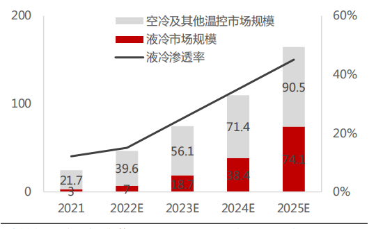 據(jù)統(tǒng)計,2022年,中國新增投運新型儲能項目達7.3GW/15.9GWh,累計裝機規(guī)模達13.1GW/27.1GWh。結合各地規(guī)劃情況,預計到2025年末,國內儲能累計裝機規(guī)模有望達到近80GW。據(jù)高工產業(yè)研究院 (GGII)分析,2025年國內儲能溫控出貨價值量將達到165億元隨著儲能能量和充放電倍率的提升,中高功率儲能產品使用液冷的占比將逐步提升,液冷有望成為未來主流方案,其中液冷技術到 2025 年滲透率有望達到 45%左右。