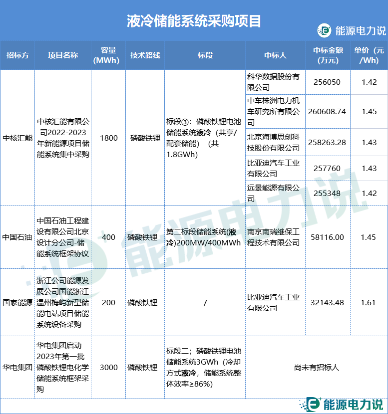大型能源集團已經開始液冷儲能系統(tǒng)的招標,據(jù)統(tǒng)計,中核集團、中石油、國家能源集團、華電集團等公司進行了液冷儲能系統(tǒng)采購項目,液冷系統(tǒng)規(guī)模約5.4GWh,采購單價在1.42元/Wh-1.61元/Wh。