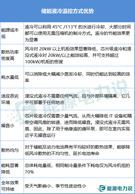 其中液冷技術通過液體對流直接散熱的方式,能夠實現(xiàn)對電池的精確溫控,確保降溫均勻性。相比之下,風冷技術成本較低,但是散熱效率并不高,而且無法實現(xiàn)對電池的精確溫控。因此,在低功率場景下,風冷仍然是主流,而在中高功率場景下,液冷技術占據(jù)了主導地位。液冷系統(tǒng)有大比熱容和快速冷卻等優(yōu)點,能夠更加有效地控制電池的溫度,從而保證儲能電池的穩(wěn)定運行。