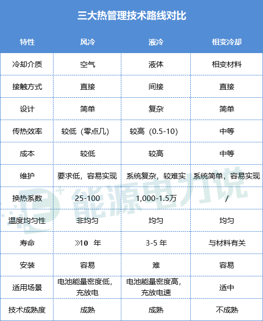 目前儲能熱管理的主流技術路線是風冷和液冷。儲能熱管理技術路線主要分為風冷、液冷、熱管冷卻、相變冷卻,其中熱管和相變冷卻技術尚未成熟。