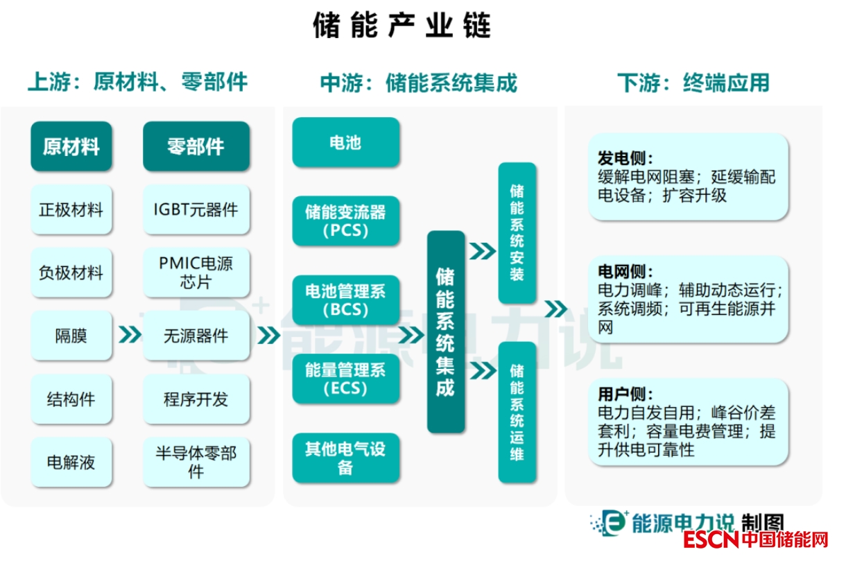 儲(chǔ)能產(chǎn)業(yè)鏈整體圍繞電池開展,主要包括上游原材料及零部件的供應(yīng)商,中游核心環(huán)節(jié)儲(chǔ)能系統(tǒng)集成,含電池組、儲(chǔ)能變流器(PCS)、電池管理系統(tǒng)(BMS)、能量管理系統(tǒng)(EMS)四大關(guān)鍵部分以及其他設(shè)備,主要應(yīng)用在發(fā)電側(cè)、電網(wǎng)側(cè)、用戶側(cè)和微電網(wǎng)四大領(lǐng)域,其中發(fā)電側(cè)受益于新能源產(chǎn)業(yè)發(fā)展帶動(dòng),是推動(dòng)儲(chǔ)能市場(chǎng)的主要?jiǎng)恿Α?