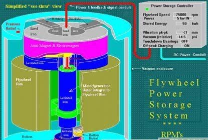 1994年,美國阿貢(ANL)國家實驗室用碳纖維試制一個儲能飛輪:直徑38厘米,質(zhì)量為 11千克,采用超導(dǎo)磁懸浮,飛輪線速度達(dá)1000米/秒。它儲的能量可將10個100瓦燈泡點(diǎn)燃2~5小時。該實驗室目前正在開發(fā)儲能為50千瓦小時的儲能輪,最終目標(biāo)是使其儲能達(dá)5000千瓦小時的儲能飛輪。一個發(fā)電功率為100萬千瓦的電廠,約需這樣的儲能輪200個。