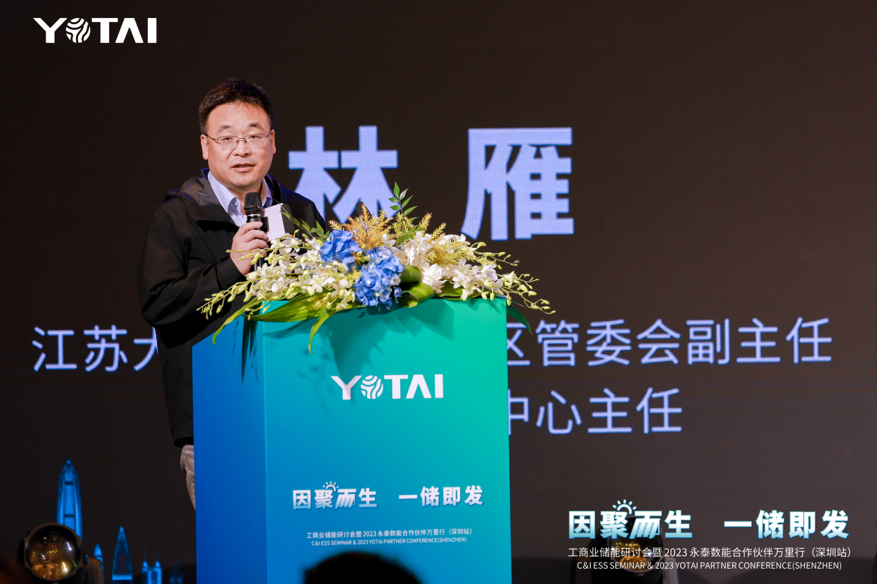 隨后,上海恒時計算機信息技術有限公司、華夏銀行代表服務合作伙伴,分別分享了在交付方面、金融方面可以提供的服務與支持;能鏈集團執(zhí)行總裁兼儲能事業(yè)群總裁王春翔、江蘇大豐港經(jīng)濟開發(fā)區(qū)管委會副主任,大豐投資促進中心主任林雁進行了案例分享。此外,永泰數(shù)能工商業(yè)儲能解決方案總監(jiān)廖志明、永泰數(shù)能行業(yè)銷售總監(jiān)張啟福也分別在現(xiàn)場對工商業(yè)儲能解決方案、綠色出行及光儲充解決方案進行了詳細介紹。
