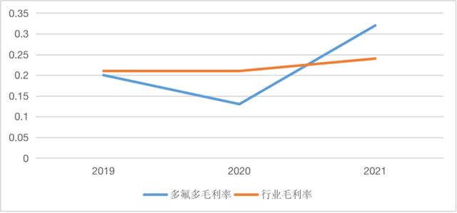 圖3 2019年~2021年多氟多和所在行業(yè)毛利率的變動情況