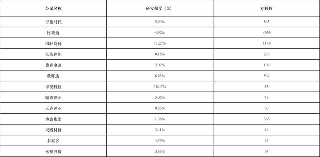 表1 “電池供應(yīng)鏈”賽道企業(yè)研發(fā)強度和專利數(shù)