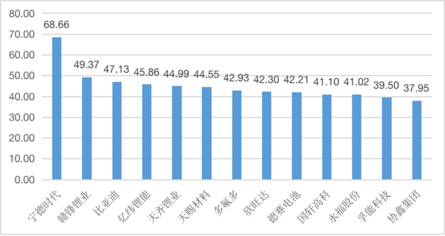 圖1 “電池產(chǎn)業(yè)鏈”賽道企業(yè)品牌優(yōu)勢值(100分制)