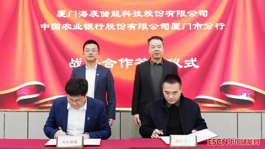 海辰儲能聯(lián)合創(chuàng)始人、總經理王鵬程、農業(yè)銀行廈門分行黨委書記、行長吳剛見證,海辰儲能董事、副總經理龐文杰、農業(yè)銀行廈門分行黨委委員、副行長白雙慶代表雙方簽約,海辰儲能財務總監(jiān)蘇振金、農業(yè)銀行廈門分行公司業(yè)務部總經理周亞倩等出席。