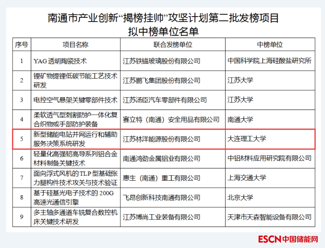 中國儲能網(wǎng)訊:近日,南通市科學(xué)技術(shù)局對南通市產(chǎn)業(yè)創(chuàng)新“揭榜掛帥”攻堅計劃第二批發(fā)榜項目擬中榜單位進(jìn)行公示,林洋能源“新型儲能電站并網(wǎng)運(yùn)行和輔助服務(wù)決策系統(tǒng)研發(fā)”項目,通過形式審查、同行評議、項目公示、專家認(rèn)證等層層遴選,成功獲批2022年度南通市產(chǎn)業(yè)創(chuàng)新第二批“揭榜掛帥”攻堅計劃聯(lián)合發(fā)榜項目,最終由公司產(chǎn)學(xué)研合作單位大連理工大學(xué)成功中榜!