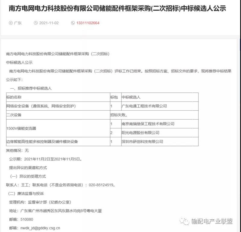 近日,南方電網(wǎng)電力科技股份有限公司儲能配件年度框架采購結(jié)果公示,在低壓儲能變流器、1500V儲能變流器2個標段,南瑞繼保全部名列第一,成功中標。