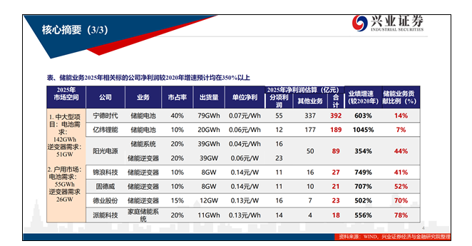 據(jù)興業(yè)證券預計,截至2021年底,化學儲能領域的電池PACK市場規(guī)模將達204億元,而到2030年,電池PACK的市場規(guī)模將超4000億元.而據(jù)興業(yè)證券測算,截至2025年寧德時代的儲能業(yè)務國內市占率將達40%,并提供約55億元的利潤.按60倍市盈率的估值測算,屆時寧德時代的儲能業(yè)務將為其帶來超過3000億元的市值.