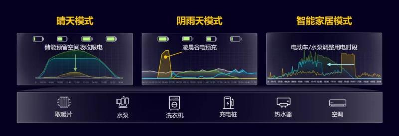在晴天/陰雨天/智能家居三種常見模式下,AI能全天候最優(yōu)控制儲(chǔ)能充放電及智能家居用電,從而實(shí)現(xiàn)每種場(chǎng)景下綠電收益最大化,并有效提升綠電自用比率。