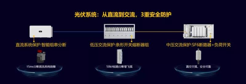 ? 光伏系統(tǒng)3重安全防護(hù):從直流、低壓交流到中壓交流,通過智能組串分?jǐn)?條形開關(guān)熔斷器組+SF6斷路器和負(fù)荷開關(guān),實(shí)現(xiàn)端到端的安全;