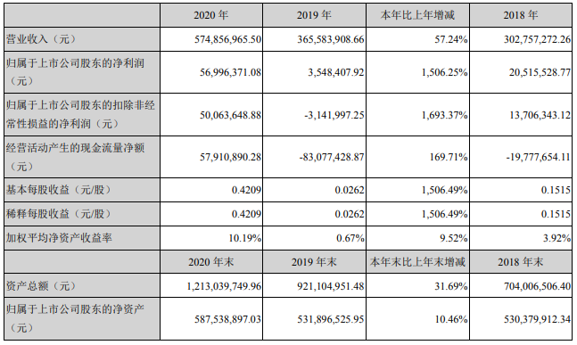 4月23日晚間,星云股份披露2020年年度報告,公司去年實現(xiàn)營業(yè)收入5.75億元,較上年同比增加57.24%;實現(xiàn)歸屬于上市公司股東的凈利潤5699.64萬元,較上年同期上升1506.25%。