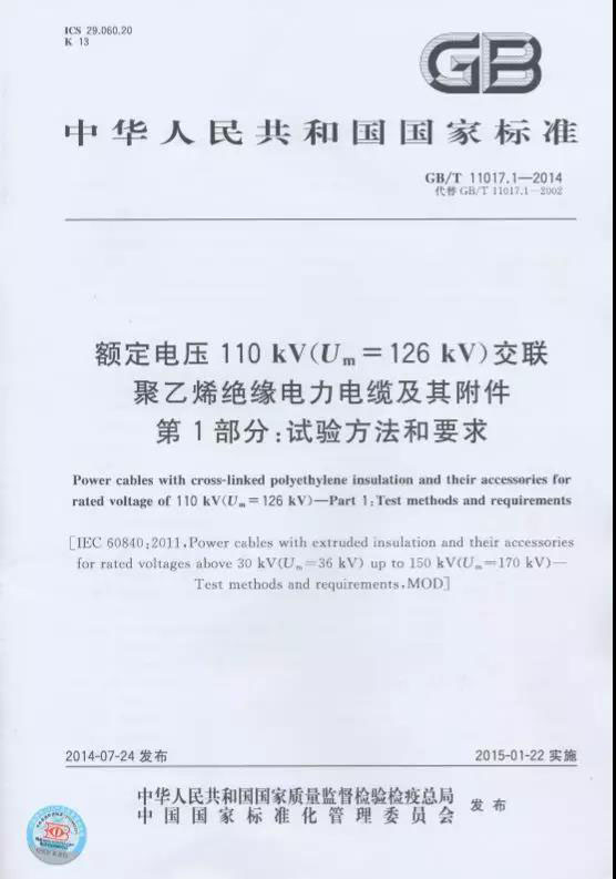 廣州嶺南電纜股份有限公司參與起草了《額定電壓110kV交聯(lián)聚乙烯絕緣電力電纜及其附件第1部分:試驗(yàn)方法和要求》這項(xiàng)國家標(biāo)準(zhǔn)(GB/T 11017.1-2014)。該部分標(biāo)準(zhǔn)規(guī)定了額定電壓110kV固定安裝的交聯(lián)聚乙烯絕緣電力電纜系統(tǒng)、電纜本體及其附件本體的試驗(yàn)方法和要求。