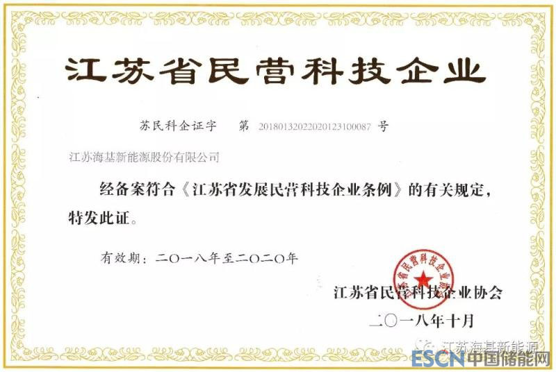 中國儲能網訊:2018年10月,經江蘇省民營科技企業(yè)協(xié)會認證,江蘇?;履茉垂煞萦邢薰痉稀督K省發(fā)展民營科技企業(yè)條例》,正式獲得“江蘇省民營科技企業(yè)”稱號。