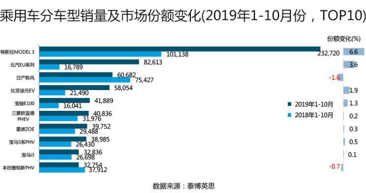 上述市場(chǎng)表現(xiàn)具體到車型層面來看:2019年1-10月,特斯拉Model 3以13.4%的市場(chǎng)份額占據(jù)首位,且市場(chǎng)份額凈增6.6個(gè)百分點(diǎn);而日產(chǎn)聆風(fēng)則出現(xiàn)了顯著的銷量同比下滑,且市場(chǎng)份額下降1.6個(gè)百分點(diǎn);和日產(chǎn)聆風(fēng)遭遇銷量和市場(chǎng)份額雙降的還有豐田普銳斯PHEV。