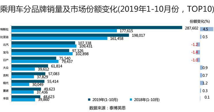 從品牌角度來看:2019年1-10月份,比亞迪和特斯拉均以超過10%的市場(chǎng)占有率居于領(lǐng)先地位,且市場(chǎng)份額在2019年獲得了顯著的增加;與之相反的是,寶馬、北汽和日產(chǎn)品牌均出現(xiàn)市場(chǎng)份額的顯著下降,其銷量相比去年同期而言也呈現(xiàn)小幅回落態(tài)勢(shì)。