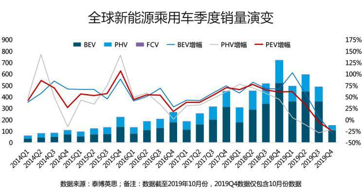 進(jìn)一步觀察全球新能源乘用車市場(chǎng)的季度銷量演變歷程,自2018年二季度開始,全球新能源乘用車季度銷量增幅呈現(xiàn)持續(xù)回落態(tài)勢(shì),其中,PHEV車型回落速度顯著快于BEV車型。尤其是進(jìn)入2019年下半年之后,在中國市場(chǎng)的直接拉動(dòng)下,2019年三季度全球新能源乘用車銷量首次出現(xiàn)下降。2019年四季度第一個(gè)月的全球新能源乘用車市場(chǎng)表現(xiàn)更值得堪憂,當(dāng)月總體降幅高達(dá)25%,其中純電動(dòng)細(xì)分市場(chǎng)降幅29%,插電式混合動(dòng)力市場(chǎng)降幅21%。