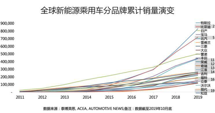 隨著全球新能源乘用車市場(chǎng)的快速成長,特斯拉、比亞迪和日產(chǎn)在全球新能源乘用車市場(chǎng)快速崛起,并居于領(lǐng)先地位;除比亞迪外,北汽、榮威、奇瑞、江淮、吉利、眾泰和知豆等中國品牌均躋身于全球新能源乘用車?yán)塾?jì)銷量前二十名之列;與之相對(duì)應(yīng)的是,傳統(tǒng)燃油車領(lǐng)域的強(qiáng)勢(shì)品牌,如大眾、豐田和福特等品牌的累計(jì)銷量和排名均相對(duì)靠后。