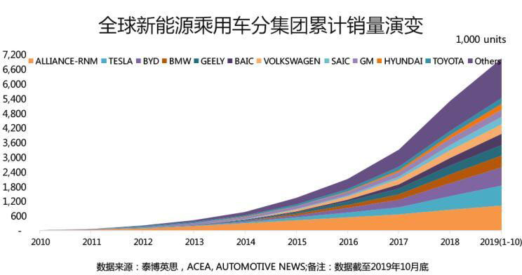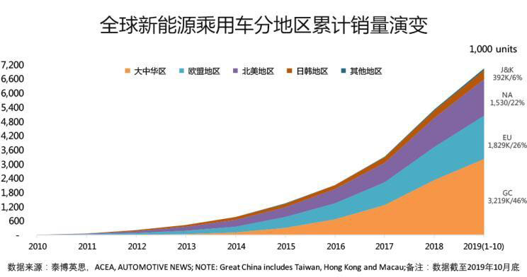 ●截至2019年10月,全球新能源乘用車?yán)塾?jì)銷量突破700萬輛大關(guān),大中華區(qū)以超過320萬輛的累計(jì)銷量占據(jù)全球46%的市場(chǎng)份額,排名第一;