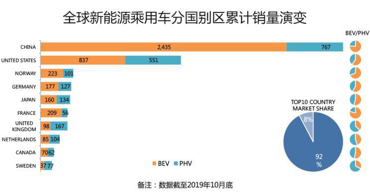 分國別來看,截至2019年10月底,中國、美國、挪威、德國、日本、法國、英國、荷蘭、加拿大和瑞典這十個(gè)國家的新能源乘用車?yán)塾?jì)銷量均超過10萬輛,且上述十國的新能源乘用車?yán)塾?jì)銷量全球占比超過92%,由此可見,全球新能源乘用車的推廣依然集中在一些頭部市場(chǎng),尤其中美兩國居于顯著的領(lǐng)先地位。