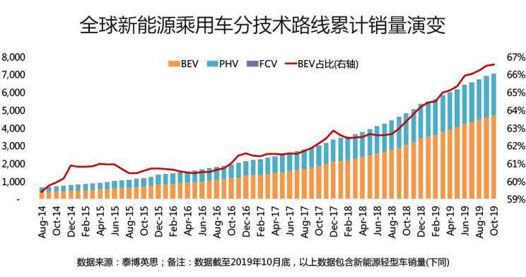 2019年,全球新能源乘用車市場(chǎng)雖然增速明顯放緩,但依然跨越了600萬這座高峰,并在2019年10月越過又一個(gè)重要的里程碑——累計(jì)銷量達(dá)704萬輛——突破700萬輛大關(guān);其中,純電動(dòng)(BEV)車型累計(jì)實(shí)現(xiàn)銷量468萬輛,占比66.6%,插電式混動(dòng)(PHEV)車型累計(jì)實(shí)現(xiàn)銷量234萬輛,占比33.2%,燃料電池(FCV)車型累計(jì)實(shí)現(xiàn)銷量1.7萬輛,占比0.2%。