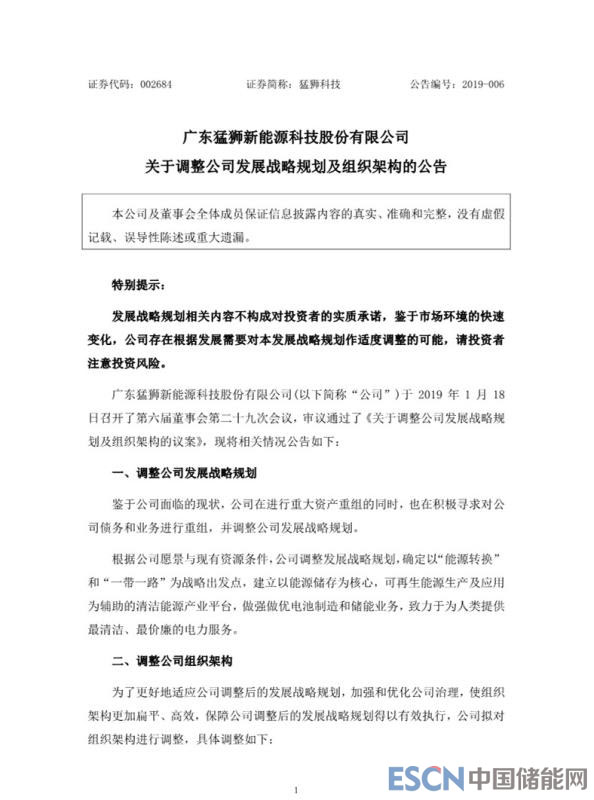 中國儲能網(wǎng)訊:據(jù)了解,近日,廣東猛獅新能源科技股份有限公司(以下簡稱“猛獅科技”)發(fā)布公告稱,根據(jù)公司愿景與現(xiàn)有資源條件,公司調整發(fā)展戰(zhàn)略規(guī)劃,確定以“能源轉換” 和“一帶一路”為戰(zhàn)略出發(fā)點,建立以能源儲存為核心,可再生能源生產及應用 為輔助的清潔能源產業(yè)平臺,做強做優(yōu)電池制造和儲能業(yè)務。