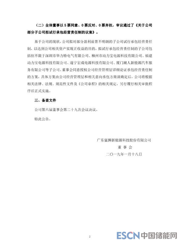 猛獅科技第二十九次會議決議公告稱基于公司的現(xiàn)狀,公司擬對部分盈利前景不明朗的子公司試行承包經營責任制,以達到公司相關資產實現(xiàn)正收益的目的,擬試行承包經營責任制的子公司包括但不限于深圳市華力特電氣有限公司、柳州市動力寶電源科技有限公司、福建 動力寶電源科技有限公司、遂寧宏成電源科技有限公司、廈門潮人新能源汽車服 務有限公司等子公司。