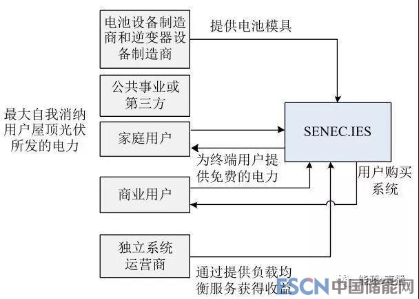 目前,與分布式光伏組合形成的分布式光儲系統(tǒng)在國外已有較多的商業(yè)應(yīng)用,在不同的國家,分布式光儲發(fā)電的應(yīng)用重點各不相同,美國加州在工商業(yè)領(lǐng)域的分布式項目居多,澳大利亞和德國市場的重點在戶用儲能領(lǐng)域。以德國 SENEC.IES 公司為例,該公司將用戶側(cè)儲能聚集起來開展“免費午餐”模式,享有對電池的主要控制權(quán),當電網(wǎng)“零電價”時控制電池從電網(wǎng)充電。用戶主要通過最大化地自我消納屋頂光伏所發(fā)的電力、使用 SENEC.IES 提供給用戶的“免費儲存的電力”,實現(xiàn)更低的電費賬單,進而獲益。SENEC.IES 的商業(yè)模式見圖5。