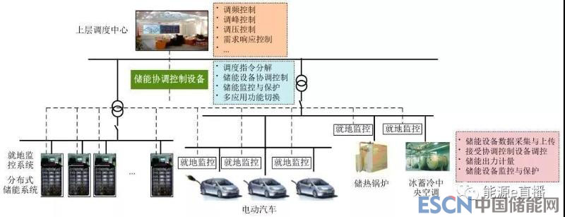 目前,國際上的分布式儲能協(xié)調(diào)控制設(shè)備研發(fā)也處在剛剛起步的過程,如德國能源供應(yīng)公司SENEC.IES,目前有 2000 個用戶參與到他們的Economic Grid計劃中,家庭用戶安裝“雙向能源管理系統(tǒng)”(簡稱 BEMI),每 15 min 儲存用戶用電數(shù)據(jù),記錄用戶用電習慣,當電價發(fā)生變動時,BEMI 通過控制分布式儲能系統(tǒng)來調(diào)控用電時間和用電量。目前國內(nèi)尚沒有分布式儲能相關(guān)產(chǎn)品,主要是借用微網(wǎng)控制器實現(xiàn)類似功能,然而微網(wǎng)控制器多用于本地控制,很少涉及到廣域多點調(diào)度相關(guān)功能,同時微網(wǎng)控制器缺乏對電池儲能系統(tǒng)在線檢測、充放電優(yōu)化控制和保護的相關(guān)功能,難以實現(xiàn)對于分布式儲能系統(tǒng)的全面控制和優(yōu)化。伴隨配網(wǎng)側(cè)分布式儲能的快速發(fā)展,面向電網(wǎng)的儲能資源匯聚應(yīng)用將包含電池儲能設(shè)備、通過 V2G并網(wǎng)的電動汽車、儲熱鍋爐、冰蓄冷中央空調(diào)等分布式儲能設(shè)備,通過多設(shè)備間的協(xié)調(diào)控制,參與電網(wǎng)調(diào)峰、調(diào)頻等應(yīng)用,如圖4所示。在這個過程中,儲能系統(tǒng)的協(xié)調(diào)控制設(shè)備在上層調(diào)度和各分散的分布式儲能資源間起到調(diào)度指令分解、儲能設(shè)備協(xié)調(diào)控制、儲能監(jiān)控與保護、多應(yīng)用功能切換等功能。