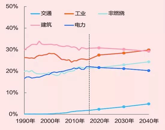 在結(jié)構(gòu)轉(zhuǎn)變過程中,不同領(lǐng)域的能源消費變化同樣顯著。BP、ETRI、IEA都注意到,全球范圍內(nèi)工業(yè)部門能源消費增長在逐漸放緩,建筑是增長最快的部門。工業(yè)部門能源需求在2040年達到峰值,之后保持穩(wěn)定,并且電氣化率還將不斷提高。BP認(rèn)為,天然氣和電力將滿足未來工業(yè)領(lǐng)域能源增量,2040年成為工業(yè)部門主要能源。