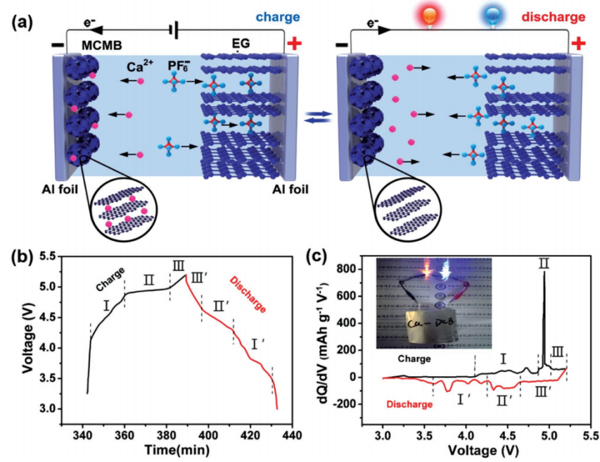鑒于此,唐永炳及其團(tuán)隊(duì)成員吳石、張帆等人成功研發(fā)出一種基于雙碳結(jié)構(gòu)的鈣型雙離子電池。該電池材料廉價易得并且環(huán)保,采用膨脹石墨作為正極材料,PF6-陰離子可以在其片層結(jié)構(gòu)中可逆地嵌入/脫出;采用中間相碳微球作為負(fù)極材料,Ca2+可以在其片層結(jié)構(gòu)中可逆地嵌入/脫出。電解液采用基于六氟磷酸鈣做電解質(zhì)的碳酸酯類電解液。研究表明,該鈣型雙離子電池可以在室溫下實(shí)現(xiàn)可逆充放電,并且表現(xiàn)出優(yōu)異的電化學(xué)性能:平均工作電壓高達(dá)4.6V,1C倍率下循環(huán)300圈后容量保持率為94%。這種新型鈣離子電池結(jié)構(gòu)設(shè)計(jì)為鈣離子電池的研究開拓了新思路,也為基于多價金屬離子電池的研究提供了借鑒意義。