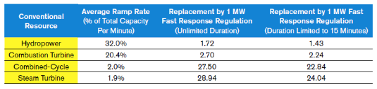 發(fā)電廠等傳統(tǒng)資源通過(guò)調(diào)節(jié)轉(zhuǎn)速響應(yīng)調(diào)頻信號(hào),存在時(shí)間延遲。換句話講,電廠調(diào)節(jié)出力需要花費(fèi)時(shí)間。儲(chǔ)能資源幾乎可瞬時(shí)調(diào)節(jié),既在一分鐘之內(nèi)實(shí)現(xiàn)100%的功率調(diào)節(jié)。2008年太平洋西北國(guó)家實(shí)驗(yàn)室研究發(fā)現(xiàn)1 MW快速調(diào)節(jié)資源可提供等效調(diào)節(jié)服務(wù)為1.7 MW水力發(fā)電機(jī)組、2.7 MW的燃?xì)鈾C(jī)組和29 MW 燃煤機(jī)組。