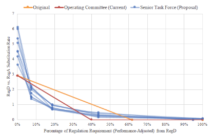 KEMA發(fā)現(xiàn)在超過(guò)某個(gè)點(diǎn)后繼續(xù)增加RegD的比例會(huì)導(dǎo)致回報(bào)降低。KEMA解釋其原因時(shí)提到“RegD的設(shè)計(jì)是為了作為RegA的補(bǔ)充,而不是承擔(dān)所有系統(tǒng)調(diào)節(jié)任務(wù)”。PJM解釋稱過(guò)多RegD資源會(huì)惡化可靠性控制的原因是RegD控制信號(hào)為了保持能量中性原則,有時(shí)運(yùn)動(dòng)朝向“調(diào)度所需要的相反方向”。實(shí)際上RegD有時(shí)候反方向運(yùn)動(dòng)的情況已經(jīng)被發(fā)現(xiàn)和計(jì)入估值系統(tǒng),因?yàn)橄到y(tǒng)可以在不惡化可靠性前提下提高RegD的比例。