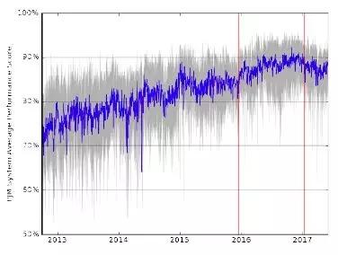 圖4顯示了PJM系統(tǒng)平均性能得分的變化情況。調(diào)節(jié)資源性能基于三個(gè)指標(biāo):準(zhǔn)確性、延遲性和精確度。準(zhǔn)確性是資源響應(yīng)調(diào)節(jié)信號(hào)的快慢;延遲性為從開(kāi)始運(yùn)動(dòng)到達(dá)到預(yù)期的延遲時(shí)間;精確度是信號(hào)和響應(yīng)之間瞬時(shí)錯(cuò)誤。