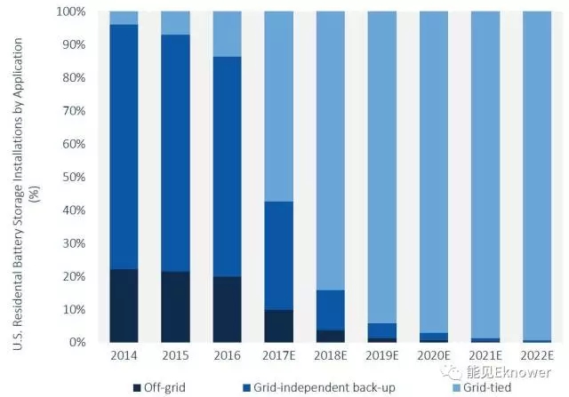 然而,今年GTM Research表示,從2017年開始我們將看到這一趨勢(shì)的重大逆轉(zhuǎn)。到2017年底,并網(wǎng)電池系統(tǒng)將占所有系統(tǒng)的57%。到2022年,這個(gè)數(shù)字將會(huì)上升到99%,因?yàn)槊磕甑碾x網(wǎng)電池系統(tǒng)和備用電源都保持相對(duì)平穩(wěn)的態(tài)勢(shì)。