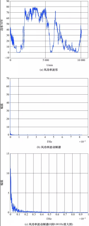 以某100MW風場為例,圖1為典型的風功率波形圖和波動頻譜圖,功率采樣周期為1min,采樣時長為一周,則采樣點數(shù)為10?080(即24×7×60=10?080)。通過FFT快速分解得到風功率的頻譜特性,從圖1(b)、(c)中可知,風功率頻段大部分處于低頻段,高頻或中高頻部分極少。