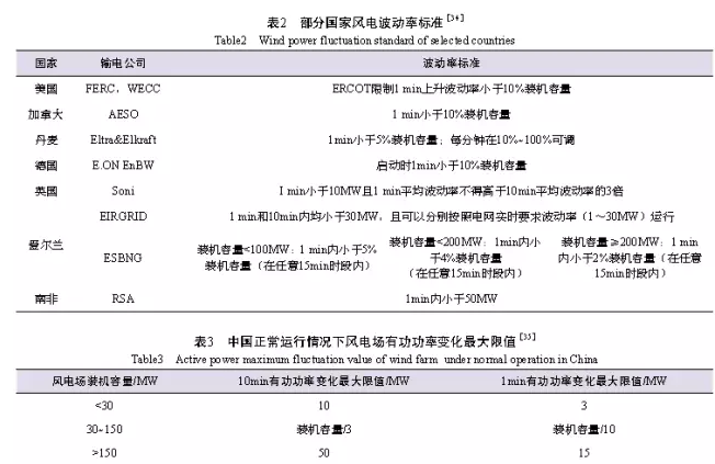 以上文獻只是單純地進行風光出力波動的平抑,沒有考慮相關的優(yōu)化目標或約束條件。目前對于風光波動標準的制定,特別是在國內(nèi)還處于起步階段。最初風電并網(wǎng)時,并未對風電的功率波動制定相關標準,隨著風電裝機容量的增加,為了減少風電波動對電網(wǎng)的影響,各國開始對風電波動制定標準,這主要體現(xiàn)在爬坡率上。不同國家的輸電公司或是電力部門對風電爬坡率的要求有所不同。表2、表3分別是國外部分國家和中國對風電波動率的相關要求。