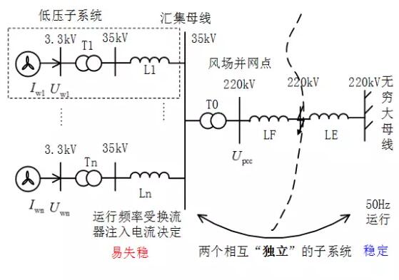 如圖3所示,當(dāng)電網(wǎng)發(fā)生三相金屬性短路故障后,短路點(diǎn)的電壓為零,風(fēng)電系統(tǒng)與外部電源之間的耦合作用為零,二者會(huì)成為了兩個(gè)完全獨(dú)立的系統(tǒng)。外部電網(wǎng)由于常規(guī)同步發(fā)電機(jī)的支撐作用,其運(yùn)行頻率維持在50Hz。而風(fēng)電場失去了外部電網(wǎng)的支撐,成為了一個(gè)相對(duì)獨(dú)立的孤島電網(wǎng)。如果此時(shí)風(fēng)電場根據(jù)并網(wǎng)導(dǎo)則在低電壓穿越期間必須向系統(tǒng)注入無功電流,可能會(huì)引起風(fēng)電系統(tǒng)發(fā)生頻率失穩(wěn)現(xiàn)象,進(jìn)而導(dǎo)致風(fēng)電場低電壓穿越失敗。