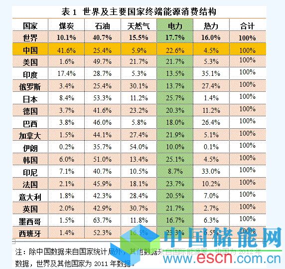 中國儲能網(wǎng)訊:電能占終端能源消費(fèi)的比重代表電力替代煤炭、石油、天然氣等其它能源的程度,是衡量一個國家終端能源消費(fèi)結(jié)構(gòu)和電氣化程度的重要指標(biāo)。電能是清潔、高效、便利的終端能源載體,在大力推進(jìn)低碳發(fā)展,大規(guī)模開發(fā)可再生能源,積極應(yīng)對氣候變化的全球發(fā)展趨勢下,提高電能占終端能源消費(fèi)比例已成為世界各國的普遍選擇。世界及主要國家終端能源消費(fèi)結(jié)構(gòu)如表1所示。