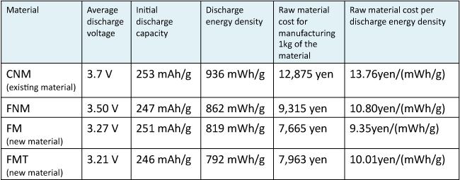 表1:現(xiàn)有正極材料和以前開(kāi)發(fā)的正極材料,比較最初的充放電特性以及新開(kāi)發(fā)的正極材料成本。來(lái)源:日本先進(jìn)工業(yè)科學(xué)和技術(shù)研究所
