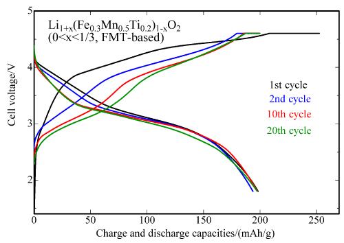 圖3:充電和放電周期特性,新開(kāi)發(fā)的基于鐵錳鈦的正極材料在30攝氏度可達(dá)到20個(gè)循環(huán)(碳被用作負(fù)極材料,電位范圍:1.8 V至4.6 V)。來(lái)源:日本先進(jìn)工業(yè)科學(xué)和技術(shù)研究所
