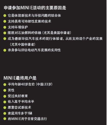 為此,寶馬集團(tuán)制定了非常嚴(yán)格的申請(qǐng)條件,除要求申請(qǐng)者是本地居民、擁有非露天停車位之外,還要求申請(qǐng)者具備5年或以上的駕齡、有私人汽車、每月駕駛MINI E的里程不少于500公里且僅供私人日常使用。