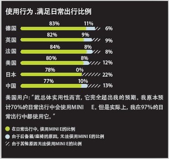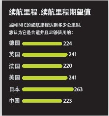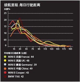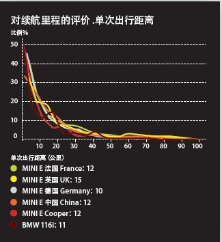 MINI E的實(shí)際續(xù)駛里程為170公里,測(cè)試結(jié)果表明,它能夠滿足用戶80%左右的日常出行。消費(fèi)者每日出行的公里數(shù)都在50公里以內(nèi),其中在中國(guó)消費(fèi)者的日平均行駛里程為49公里,單次出行的平均里程為12公里。這一測(cè)試結(jié)果與寶馬1系和MINI COOPER的調(diào)查結(jié)果完全一致。
