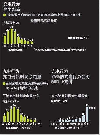 但不可避免的是,消費(fèi)者仍然對(duì)電動(dòng)汽車存在很多使用顧忌,其中最大的問(wèn)題就是不能確定電池會(huì)在什么時(shí)候出現(xiàn)沒(méi)電。所以在調(diào)查過(guò)程中這一現(xiàn)狀也得以體現(xiàn),剛開(kāi)始的時(shí)候消費(fèi)者的充電行為是一天一次,而隨著其對(duì)這款MINI E的了解,他們最終每周充電2~3次。