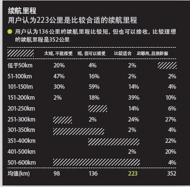 但這并不等于消費(fèi)者對(duì)電動(dòng)汽車的續(xù)駛里程沒(méi)有更高的要求,完成了5個(gè)月試駕的中國(guó)消費(fèi)者給出了自己的答案,認(rèn)為136公里為他們能夠接受的續(xù)駛里程,而要達(dá)到223公里才是他們認(rèn)為合適且足夠使用的續(xù)駛里程。