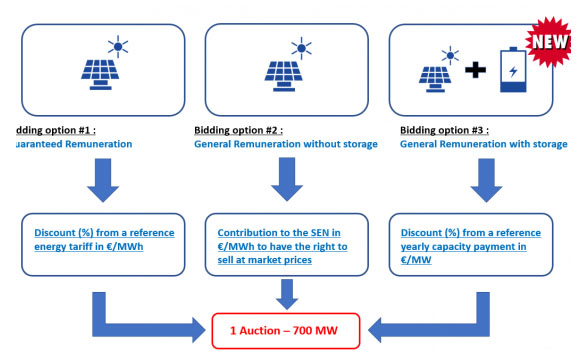 葡萄牙舉行的裝機(jī)容量為700MW太陽能發(fā)電容量拍賣活動(dòng)的三種不同選項(xiàng)