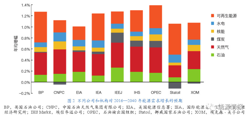 ①對(duì)于未來能源需求增長(zhǎng),世界上很多知名研究機(jī)構(gòu)都進(jìn)行過預(yù)測(cè)(圖2):可再生能源和天然氣將成為滿足未來全球能源需求增長(zhǎng)的主要來源,“低碳化”和“多元化”是未來能源發(fā)展的重要趨勢(shì)與特征。隨著太陽(yáng)能、風(fēng)能、地?zé)崮?、海洋能及?chǔ)能等新能源快速發(fā)展,能源正從過去以煤炭、油氣、電力集中式資源供給,向集中式與“分散式”并重發(fā)展。