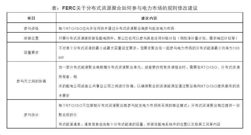 2016 年, 加利福尼亞獨(dú)立系統(tǒng)運(yùn)營(yíng)商(CAISO)、賓州-新澤西-馬里蘭州際聯(lián)合電力系統(tǒng)運(yùn)營(yíng)商(PJM)、紐約獨(dú)立系統(tǒng)運(yùn)營(yíng)商MYISO紛紛向FERC提出建議,申請(qǐng)修改其市場(chǎng)規(guī)則,推動(dòng)分布式能源聚合參與電力市場(chǎng)交易。為了響應(yīng)這些提案,2016 年11 月,F(xiàn)ERC發(fā)布了市場(chǎng)規(guī)則修改建議公告,針對(duì)如何消除電儲(chǔ)能和分布式能源聚合參與批發(fā)電力的障礙提出建議。公告首先明確了電儲(chǔ)能的定義,即“電儲(chǔ)能指存儲(chǔ)來(lái)自電網(wǎng)的電力、稍后再送電給電網(wǎng)的各種儲(chǔ)能技術(shù),包含電池、飛輪、壓縮空氣儲(chǔ)能、抽水蓄能等,且該定義與容量大小無(wú)關(guān),與其在電力系統(tǒng)中的安裝位置也無(wú)關(guān)?!贬槍?duì)分布式能源聚合,F(xiàn)ERC 提出要求每個(gè)RTO/ISO 都明確分布式能源聚合商的定義,并將其作為一類市場(chǎng)參與者,能夠在現(xiàn)有的模式下參與到批發(fā)電力市場(chǎng)中。公告還從分布式能源聚合參與電力市場(chǎng)的資格、安裝位置、容量要求、參與方之間的協(xié)調(diào)、協(xié)議等方面提出的建議,見(jiàn)下表。