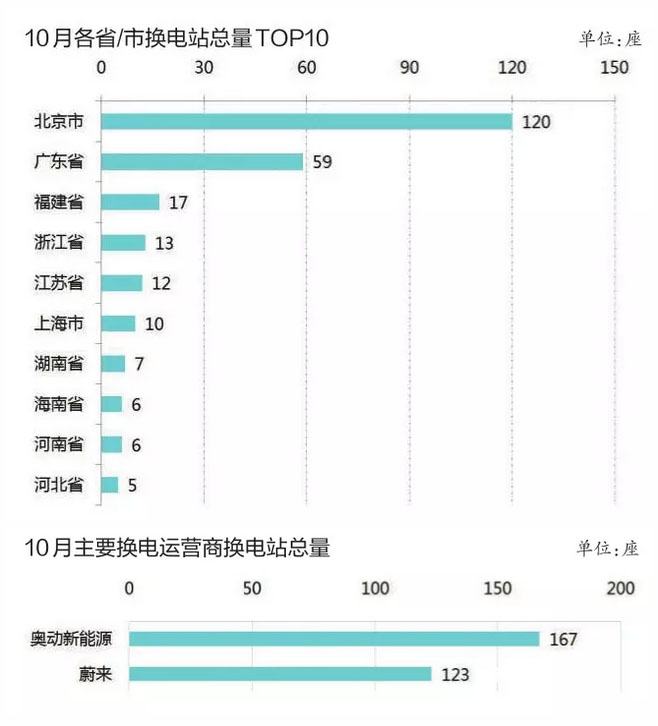 截止到2019年10月,我國(guó)共有換電站290座。其中,北京是換電站最多的地區(qū),共有120座,占總量的41.37%。此外,廣東有59座,福建、浙江、江蘇、上海的換電站保有量在10座以上,有10個(gè)地區(qū)還沒(méi)有建設(shè)換電站。從換電站運(yùn)營(yíng)商看,數(shù)量只有2家,分別是奧動(dòng)新能源和蔚來(lái),分別有167座和123座。